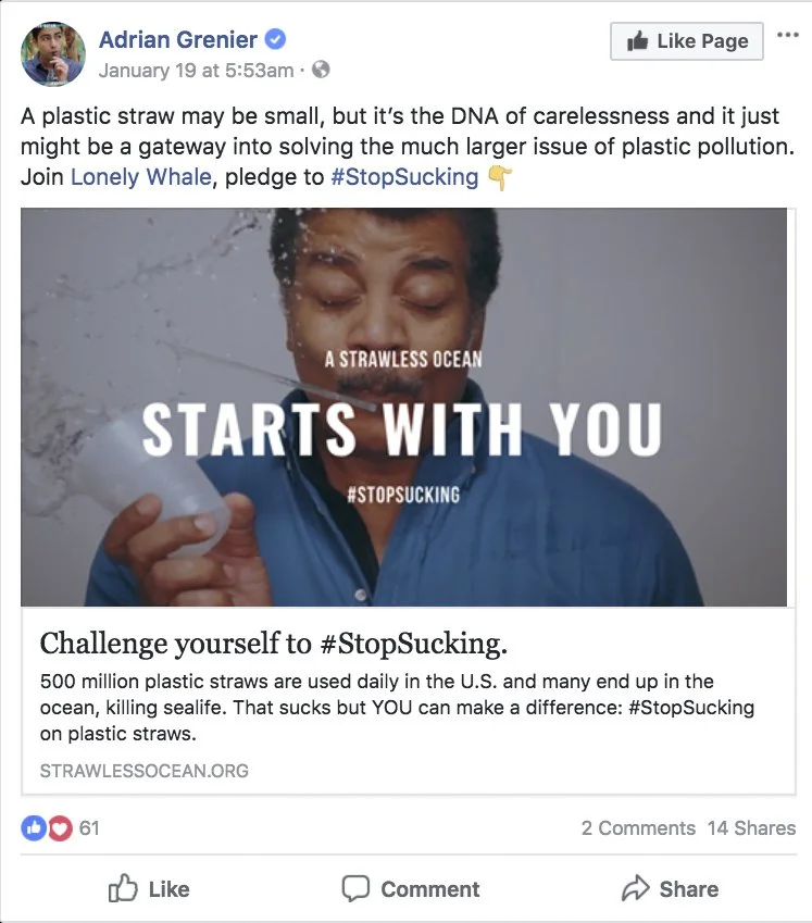 Our #StopSucking campaign brought together an intentionally broad group of celebrities, all admitting how much they “suck” on plastic straws. Adrian Grenier (who is the founder of the Lonely Whale Foundation), Van Jones, Kendrick Sampson, Amy Smart, Emmanuelle Chriqui and Lucy Sumner were all featured in the promo video for launch. With $0 media spend, our total media impressions topped 831 million. It was a call to action that reached 74 million people and 29 million plastic straws were kept out of the waste stream.